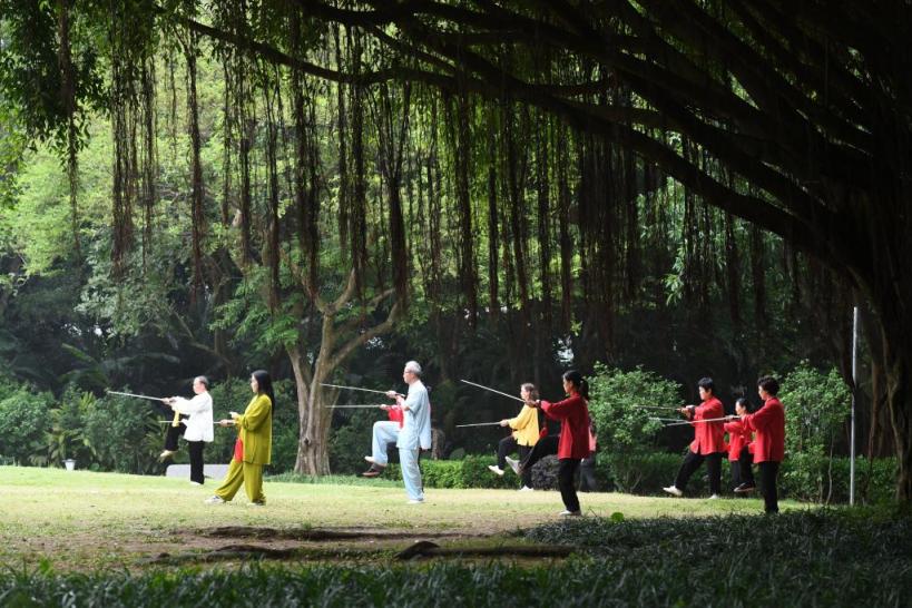 市民在南宁市南湖边的榕树下健身(2022年4月21日摄)。