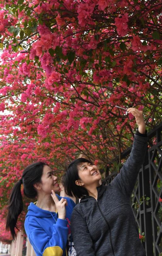 市民在南宁市青环路玩赏怒放的三角梅(2019年3月30日摄)。