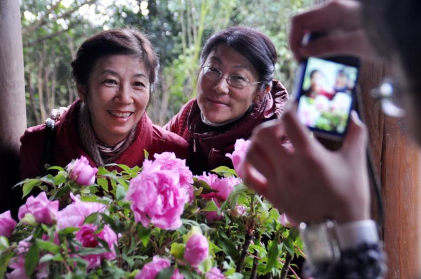 在南宁市青秀山民族风情长廊,两名旅客与牡丹花合影(2012年1月24日摄)。