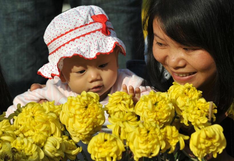 又名市民带着小孩在南宁市南湖广场玩赏菊花(2012年11月18日摄)。
