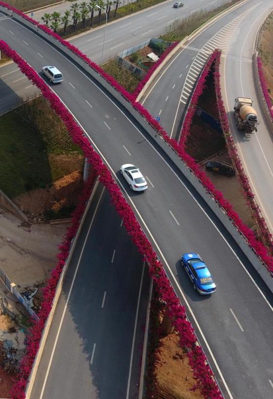 车辆从开满鲜花的南宁市竹溪立交桥经由(2019年8月31日摄)。