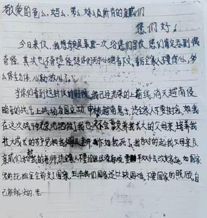 阆中籍义士蒙林阵一火前,给父母的临了一封家信写说念:“假如我死了,……请全家东说念主不要给组织添缺乏,要凭双手去改革家庭,如国度发的抚恤金,全部交给国度,目下我们国度还比拟发愤,不要国度的顾问,我方能措置的,顽强不要国度的顾问。”