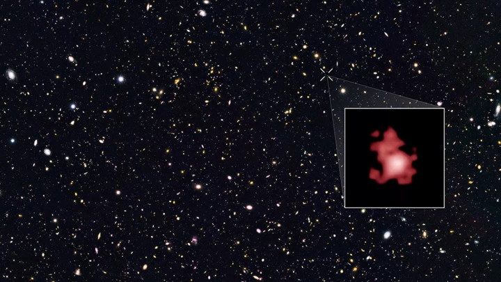 这个能容纳数千亿颗恒星的庞杂天体,在相片里却如沙粒般眇小密集,它所处的时刻距离世界出生仅约 2.8 亿年,一举冲破此前最远星系的不雅测记载。